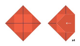 Durante l'apertura delle falde superiore e inferiore, portare al centro le due falde laterali. Quindi, piega nuovamente ogni pezzo verso il centro in modo che le linee rette verticali dei bordi incontrino quelle al centro.