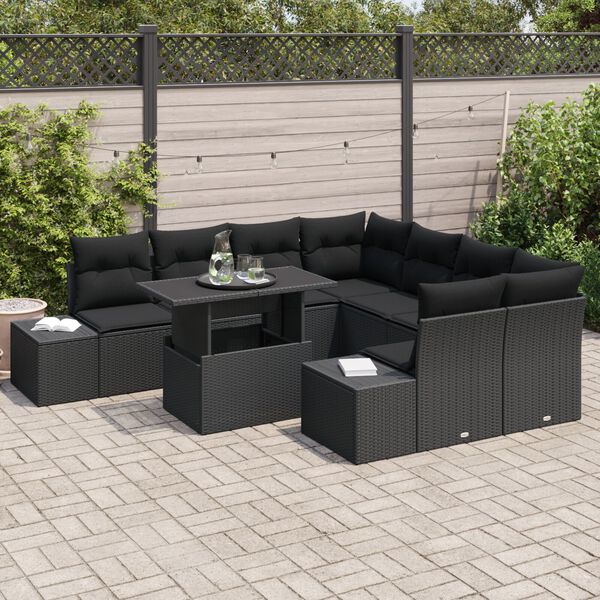 Il set di divani da giardino porta il relax all’aperto a un livello superiore di comfort e stile. Questo fantastico gruppo di mobili è pensato per chi ama il design moderno e funzionale, perfetto per giardini e terrazze. Grazie al suo design modulare, puoi adattarlo al tuo spazio e ai tuoi eventi. La combinazione di polyrattan nero e una solida struttura in acciaio offre eleganza e durata. Immagina di ospitare amici, circondato dal lusso e dal comfort di questo set realizzato con cura.