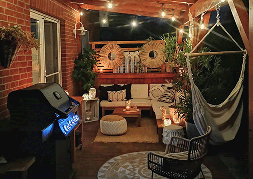 Progetta un arredamento Al Fresco che abbia un'atmosfera casalinga. Caminetti, coperte, luci e tappeti sono perfetti per la più moderna atmosfera lounge all'aperto!