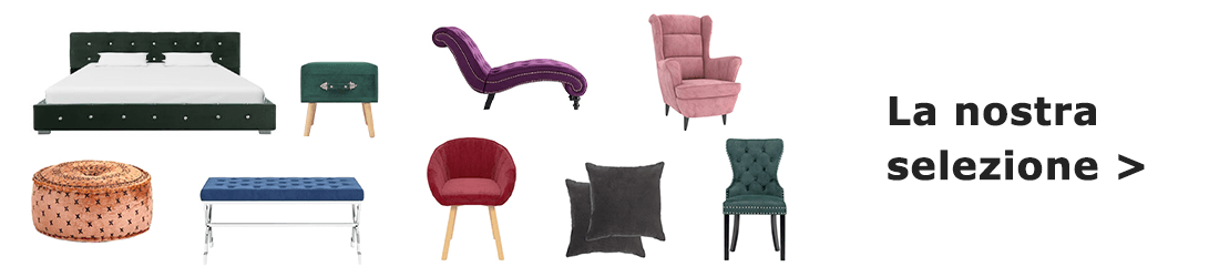 Il velluto è un materiale di spicco. Quando viene utilizzato come punto focale nell'interior design, aiuta a creare un'atmosfera diversa da qualsiasi altra. A seconda della stanza che stai arredando, scegli un mobile in velluto che attiri tutta l'attenzione. Aggiungendo un divano in velluto per il tuo soggiorno, questi farà sicuramente risplendere la stanza. Puoi scegliere tra un divano Chesterfield in velluto dai colori vivaci e uno minimalista con gambe in metallo per un look più moderno. Con l'aiuto di un letto in velluto, puoi donare raffinatezza alla tua camera da letto. Se effettivamente desideri una sistemazione elegante per la tua camera, scegli un design dettagliato o rendi più aperto il tuo spazio con linee semplici in colori neutri. Consigliamo anche di aggiungere una sedia in velluto con schienale alto per creare un angolo accogliente dove trascorrere pomeriggi rilassanti. Nella sala da pranzo, puoi aggiungere un tocco di classe scegliendo sedie da pranzo in velluto e puntare su un design moderno con una morbida trama o un rivestimento vittoriano in un velluto più scuro.